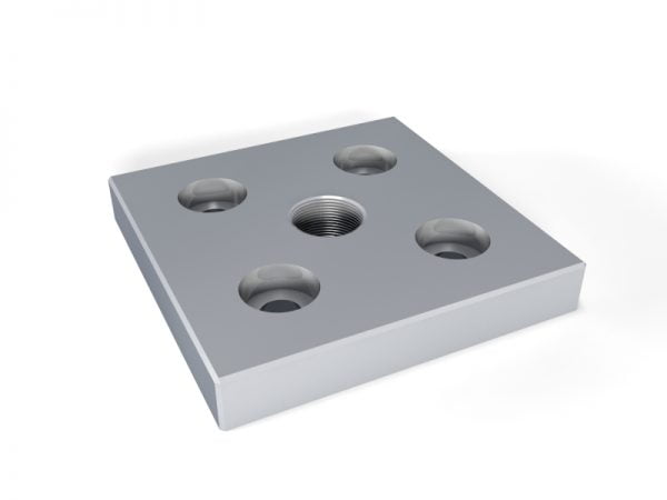 Our base plates 100100 can be attached to the end of our extruded aluminium profiles. We use these base plates to mount leveling feet to the profiles, thereby increasing the stability of the structure. All base plates come with a zinc plated finish and are made from steel. This base plate can be used on our 100X100 standard profile. You can purchase the Accessory Base Plate 100100 with the centre marked or with an M20 thread.