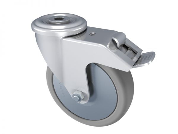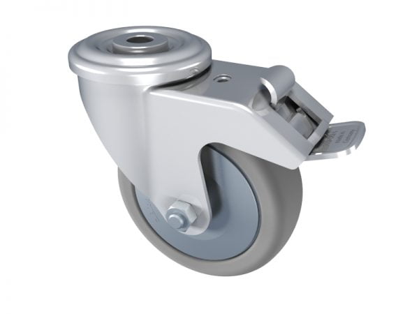 Our Castor Hole-Mount comes in various sizes to accommodate for different sizes of machine frames, work benches, trolleys, storage systems or any other structure that requires ease of movement. They come with a zinc coated body and a grey rubber tire. All of our castors are easily attached to the end of our extruded aluminium profile lengths. These castors also have a braking pedal and pivot in the direction of motion.