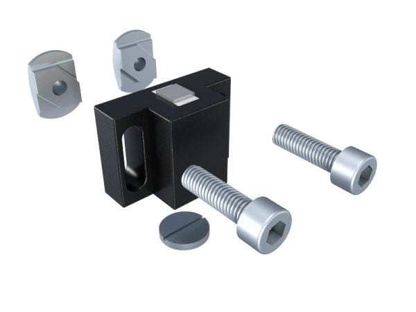 The magnetic catch accessory is used as a quick locking device for doors. It is easily attached to any structure using ISO 4962 socket head cap screws, t-nuts, and a slotted pan head screw. These are all included when bought as a kit. The ball snap catch is adaptable to the panels being used.