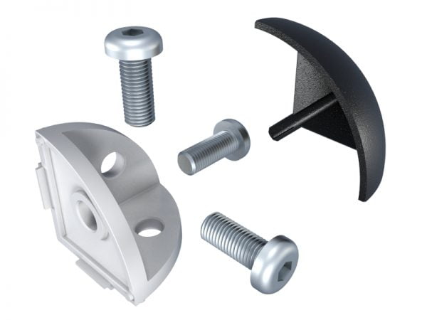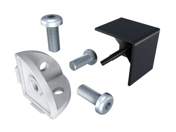 These Connector Corner Quadrant 40 can be used in constructions to connect up to three lengths of aluminium profile. They are made from zinc alloy ZP0410 and have a cast iron finish. They can be bought separately or in a kit. There are two kit options; one with a curved quadrant endcap or one with a cubed square endcap. Both kits come with the necessary screws for assembly.