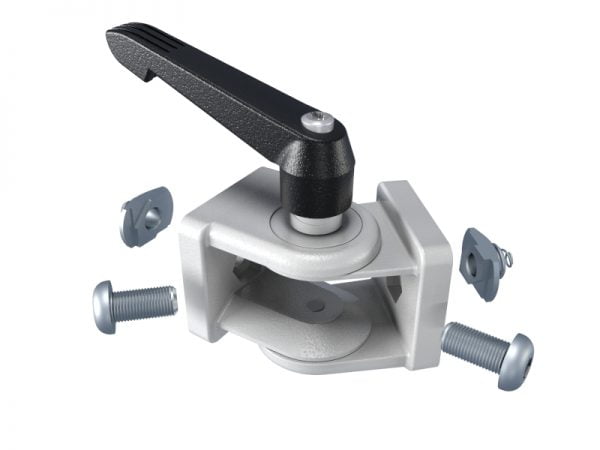 The Connector Elbow Adjustable 14 is used to construct structures using our extruded aluminium profiles. In contrast to other connectors the elbow connector can be adjusted to secure profiles at angles up to 180 degrees. This elbow connector is ideal for constructions that may require some movement and ease of adjustability. It can be adjusted and secured the required angle using the attached locking lever. This elbow connector is compatible with any other our extruded profile range, depending on its application. This product can be purchased in a kit which includes the pivot elbow connector and all the screws and fasteners necessary for assembly.